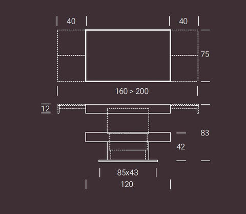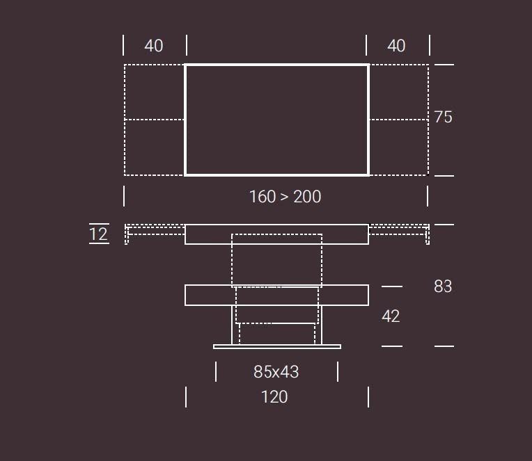 Dimensioni cm. 120x75 h 42 / cm. 160/200x75 - spessore piano 12 cm