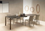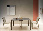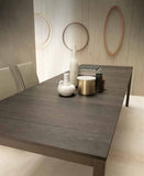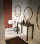 QUAD è una consolle estensibile, struttura in metallo, meccanismo telescopico in alluminio, piano in nobilitato, laccato, legno, effetto malta o ceramica,gambe centrali
