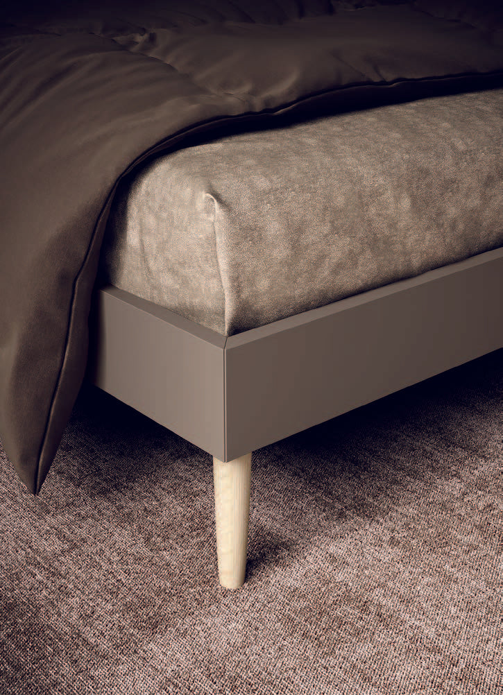 Letto COSY con giroletto SIGMA e piedini TWIG in legno di massello di frassino naturale.