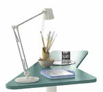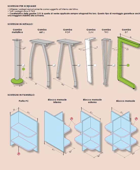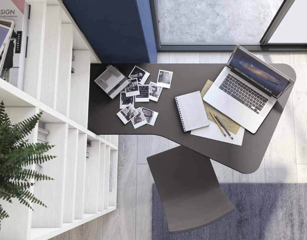 La particolare forma del piano la rende adatta anche ad essere fissata a muro cosi da avere solo una gamba o cassettiera di supporto.